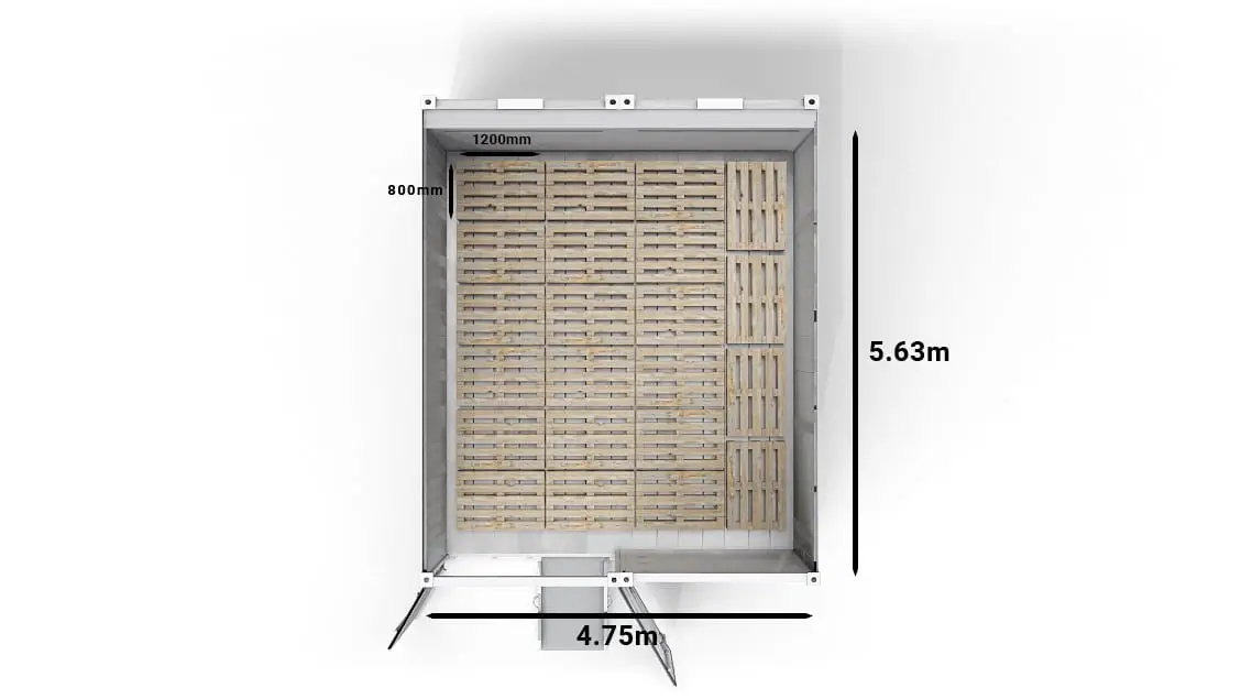 Jellegzetes modellünk alapterülete 2 és 22 raklap közötti, attól függően, hogy melyik méretet választja (a képen a 20 láb méretű ArcticStore látható).